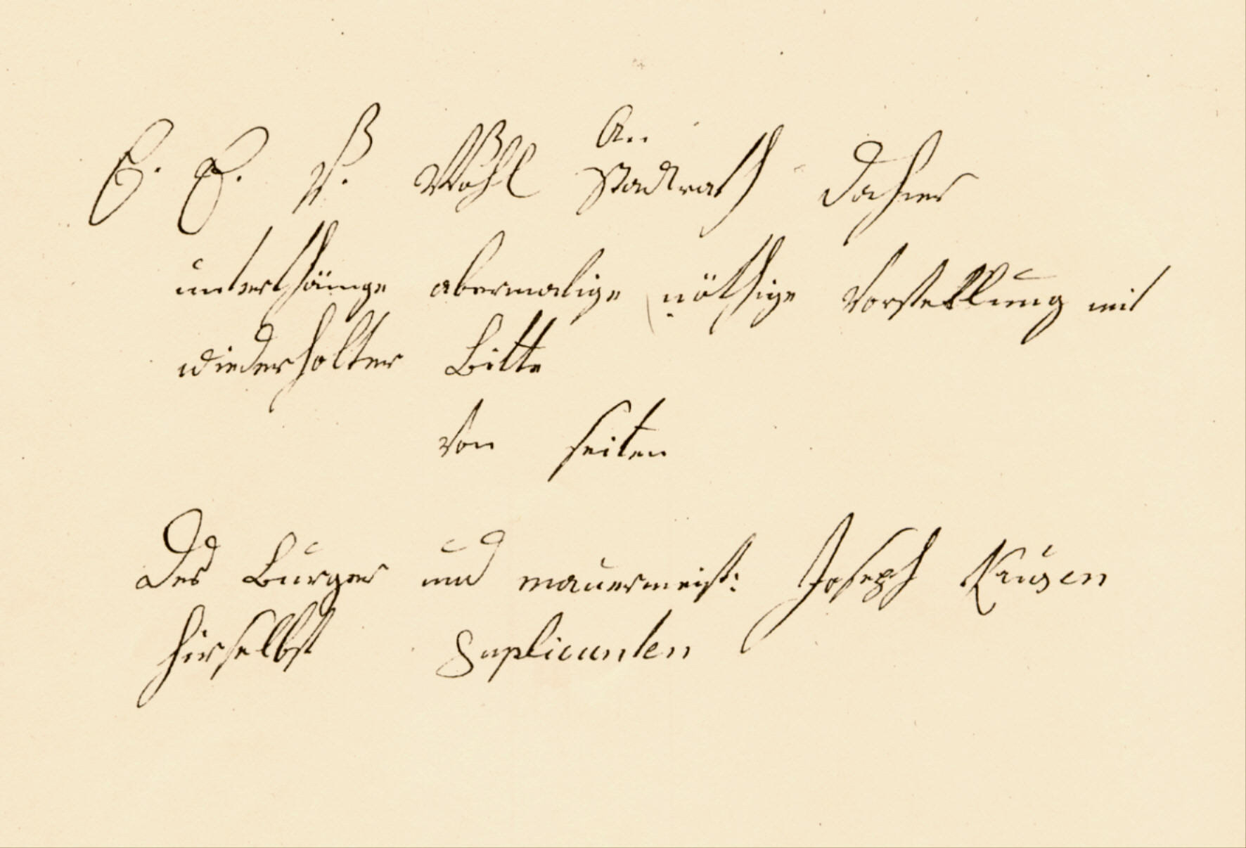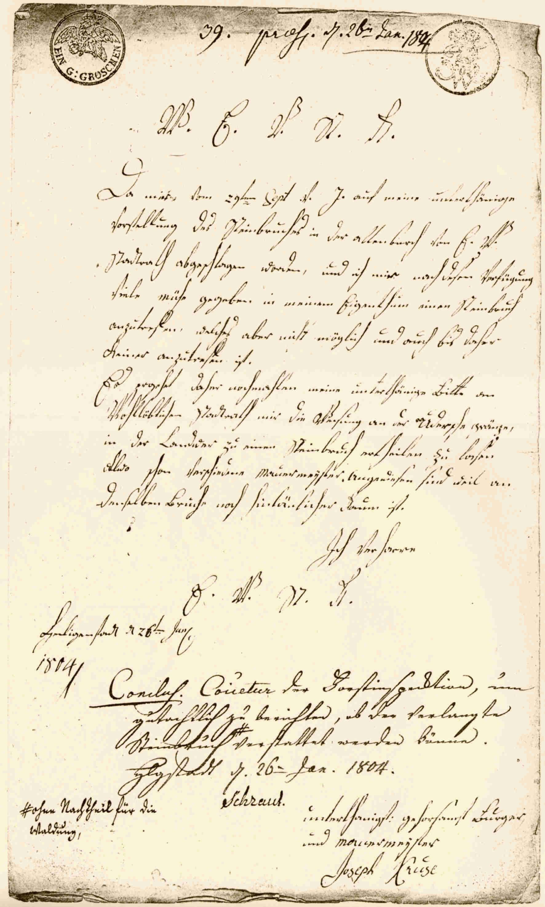 Es handelt sich hierbei um die mehrmalige Eingabe meines Ur-Ur-Ur-Ur-Ur-Großvaters (meines Obervaters) Benedict Kruse, eines Bürgers und Maurermeisters zu Heiligenstadt, sowie seines Sohnes Joseph Kruse an den wohllöblichen Stadtrat zu Heiligenstadt, um in dem Steinbruch "in der alten Burg zum Behuf des für den Kriegs- und Domainen Rath Gartschock zu erbauenden Hauses, Steine brechen zu dürfen". Übertragung in lateinische Schrift: "Gesuch des Maurermeisters Benedict Kruse um in der alten Burg, zum Behuf des für den Kriegs- und Domainen Rath Gartschock zu erbauenden Hauses, Steine brechen zu dürfen." "An E. E. V. Wohl Stadtrath dahier unterthänige abermalige nöthige Vorstellung mit wiederholter Bitte Von seiten des Burgers und maurermeisters Joseph Krusen hierselbst Suplicanten" "39. praes. d. 26ten Jan. 1804 W. E. V. St. H. Da mir vom 29ten Sept v. J. auf meine unterthänige Vorstellung des Steinbruches in der alten burch von E. W. Stadtrath abgeschlagen worden, und ich mir nach dieser Verfügung viele mühe gegeben in meinem Eigenthum einen Steinbruch anzutrefen, welches aber nicht möglich und auch bis daher keiner anzutreffen ist. Es ergeht daher nachmahlen meine unterthänige Bitte an Wohllöblichen Stadtrath mir die Weisung an der Udersche gränze, in der Landwer zu einen Steinbruch ertheilen zu lasen allwo schon verschiedene maurermeister angewiesen sind weil an denselben Bruche noch hinlänlicher Raum ist. Ich verharre E. W. St. H. Heiligenstadt d 26ten Jan. 1804 Conclus. Coultur der Forstinspektion, um gutachtlich zu berichten, ob der verlangte Steinbruch ohne Nachteil für die Waldung, verstattet werden könne. Hlgstadt d. 26ten Jan. 1804. Schraut. unterthanigst, gehorsamts Bürger und maurermeyster Joseph Kruse" Wie die Entscheidung des Stadtrates ausfiel, ob Benedict Kruse die Steine brechen durfte oder nicht, konnte leider nicht mehr geklärt werden. |